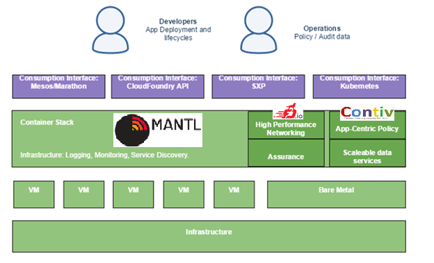The container stack layer consists of the innovation coming out of the Cisco's Cloud Platform, Enterprise, and Networking Engineering. Mantl provides the cloud native open source platform with fully integrated development plug-ins, secure DevOps, Mesos and Kubernetes orchestration, CI/CD, and a fully integrated data platform. We have hardened the microservices infrastructure and created differentiation in the orchestration, service discovery, and networking areas. Specifically, we have improved the performance of the network in both the user and control planes.