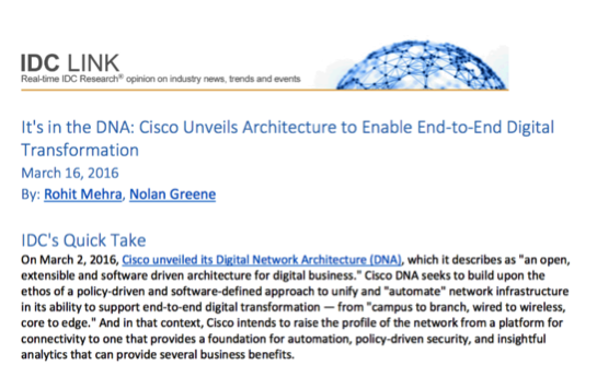 - IDC: "For Cisco, DNA establishes leadership in the enterprise (campus) SDN and NFV space... This provides an opportunity for Cisco to leverage its proven enterprise networking technologies in the context of an automated, programmable infrastructure that is now relatively open as well."