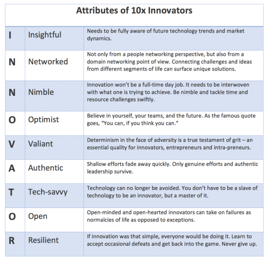 10x innovators are those who have the knowledge, skills and a burning desire to exponentially spread the genuine spirit and disciplined practice of innovation.