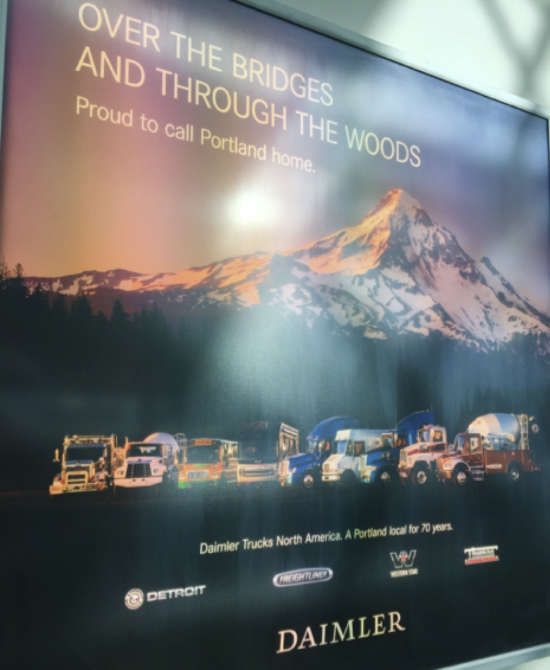 DTNA is one of the biggest employers in Portland and is known for the power, reliability, and innovation of its vehicles. With brand names such as Western Star, Freightliner, Detroit, and Thomas, their leading-edge trucks may remind you of Optimus Prime in the Transformers movies. On the way to film the story, we were excited to see this poster greet us at the airport: