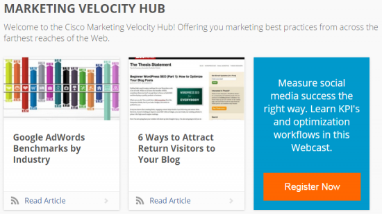 With the Marketing Velocity Hub, you will have always-on access to consistent best practices NOT just from Cisco, but from across the globe! Training will also be available so you can hone your marketing skills -with each course you take you will receive a certification of completion. No longer do we require you to take multiple courses, electives and classes. Imagine - you can be the envy of your colleagues with your newly acquired marketing knowledge.
