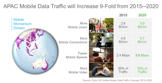 - Demand: With the latest Cisco Visual Network Index (VNI) report for 2015 to 2020, we start to get a feel for what networks are up against. In APAC we can expect almost 6 billion connections as we head into the "Internet of Everything", with >3 times connection speeds, creating 9 times more traffic then today. People tend to forget the "Data Tsunami" (a previous MWC buzz word) but the tide is still coming in.