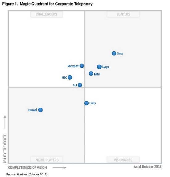 Telephony: For the 13th year in a row, Gartner positions Cisco as leader in its Magic Quadrant for Corporate Telephony. Still the foundational element in business communications, telephony is often the most important consideration when choosing a UC vendor.