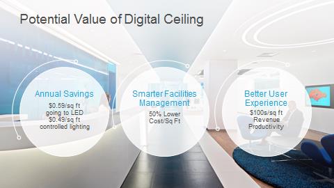 The potential is incredible. Imagine an office building where by checking into a room, that user's preferred light intensity and color, room temperature, and phone and video profiles are automatically set. Consider a workplace scenario where daylight harvesting, automatic dimming controls, and presence-based lighting save energy and reduce costs. Picture a retail environment where Digital Ceiling analytics of traffic patterns are used to improve store layouts, merchandise placement, staff allocations, and security.