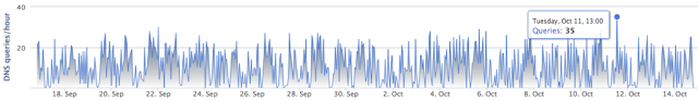 The images below, taken from Umbrella Investigate, nicely illustrate the difference between a typical snowshoe spam campaign versus a typical hailstorm spam campaign. The top image below illustrates what the DNS query volume looks like for a domain involved in a typical snowshoe attack. Note the maximum query rate is only 35 queries per hour for the snowshoe domain example. The bottom graph, in contrast, shows the DNS query volume for a domain involved in a typical hailstorm attack. In this graph, there is practically no query volume until suddenly when the DNS query volume spikes to over 75K queries per hour, then drops back down to nothing.