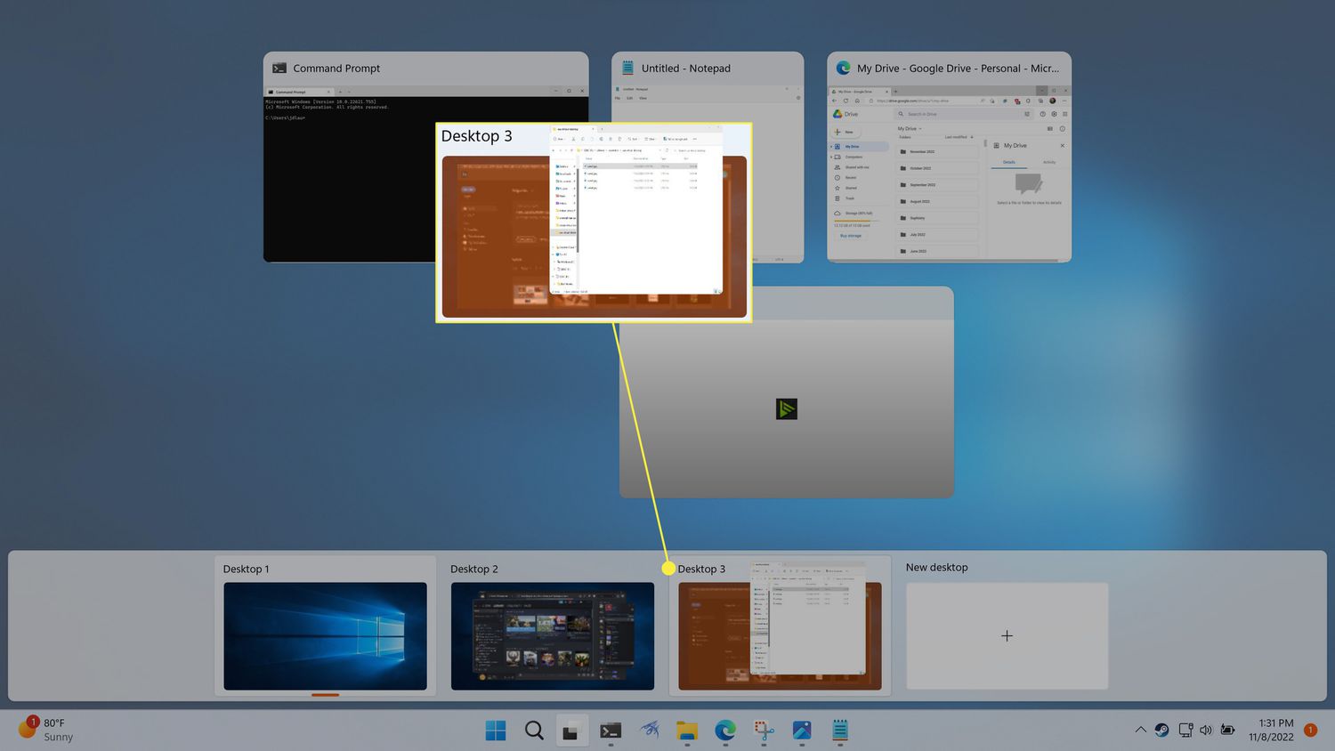There are three ways to switch desktops in Windows 11. You can use the full Task view window, the Task view popup, or a keyboard shortcut.