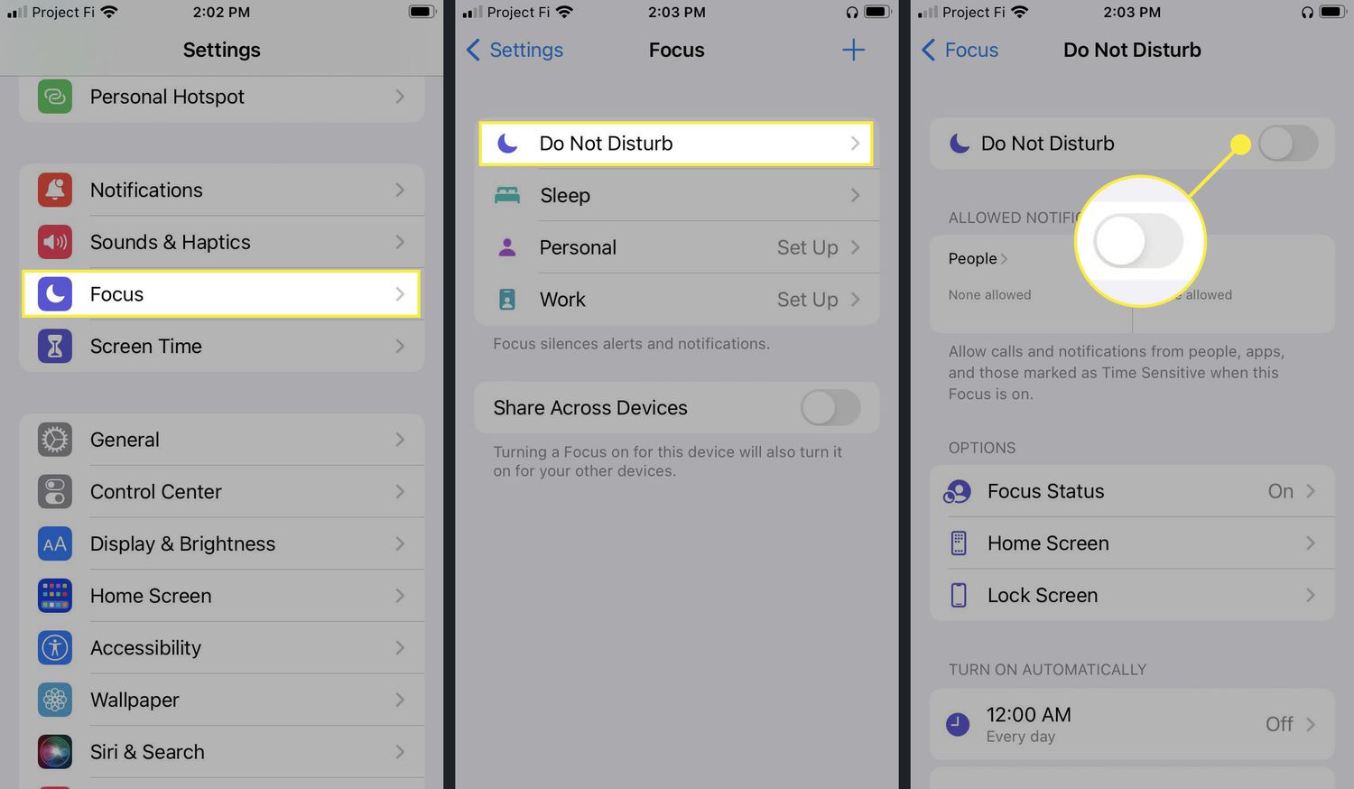 - Turn on Do Not Disturb from Settings: Navigate to Settings > Focus > Do Not Disturb > Do Not Disturb.