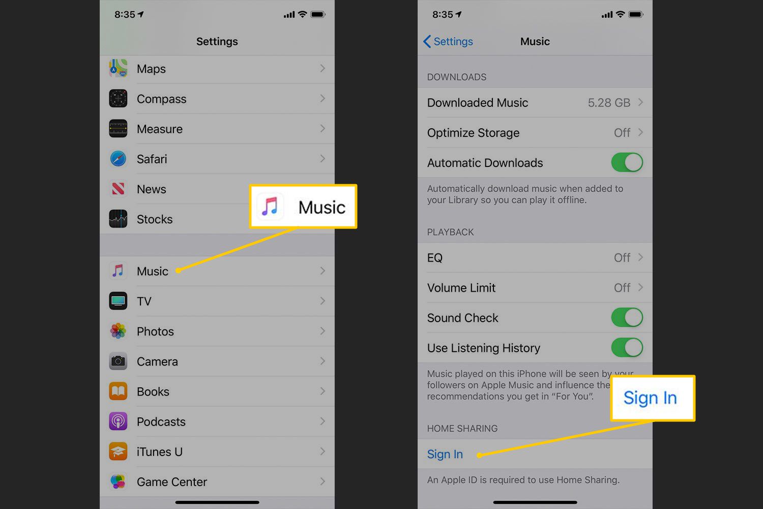 - iOS: Tap Settings > Music > in Home Sharing section, tap Sign In. Log in with Apple Account.