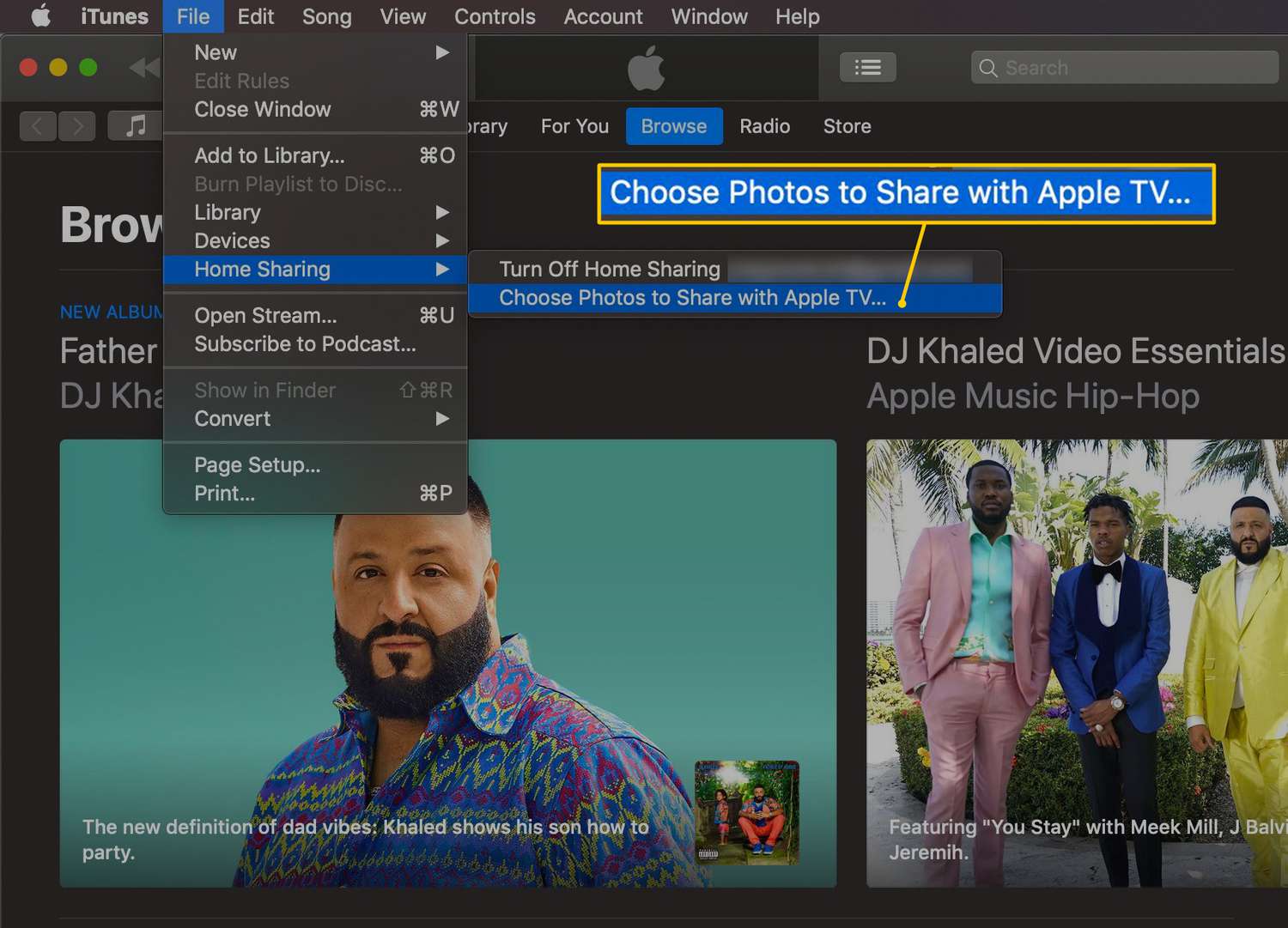 - Apple TV: Open iTunes on computer > File > Home Sharing > Choose Photos to Share with Apple TV.