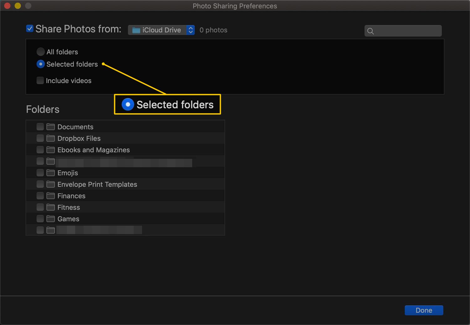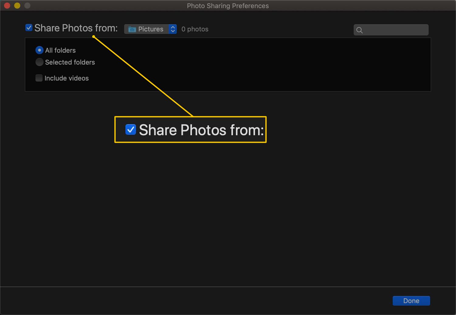 In the Photo Sharing Preferences window, select the Share Photos from check box.