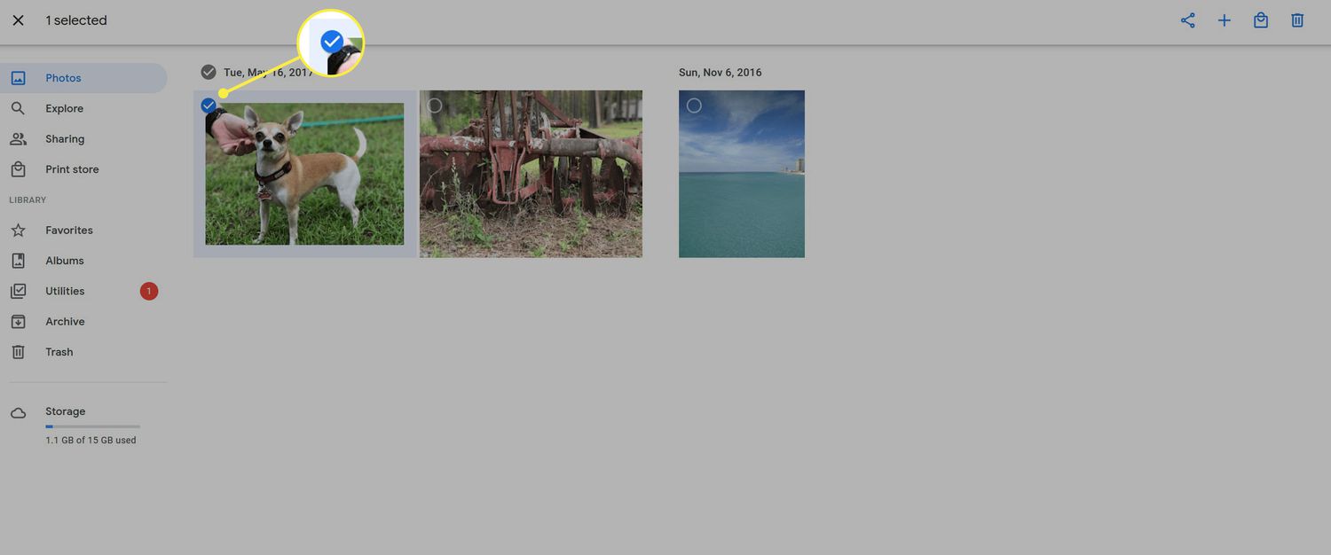 Find the photos you want to export and select them using the small checkmark in the top corner of the images. Alternatively, mark all for export by selecting the top left-most photo and holding Shift (Windows) or Command (Mac) while you scroll to the bottom of the page.