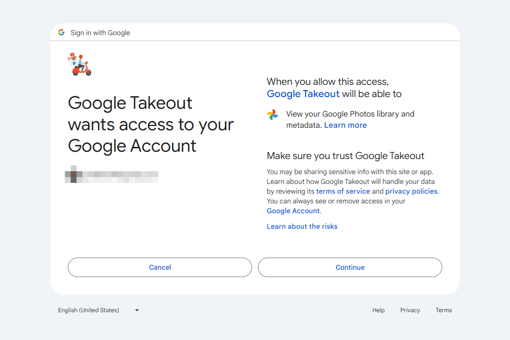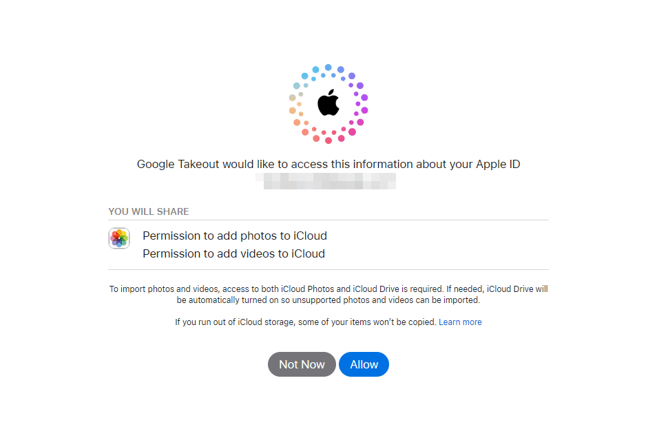 Select Allow to give Google Takeout permission to add photos and videos to your iCloud account.