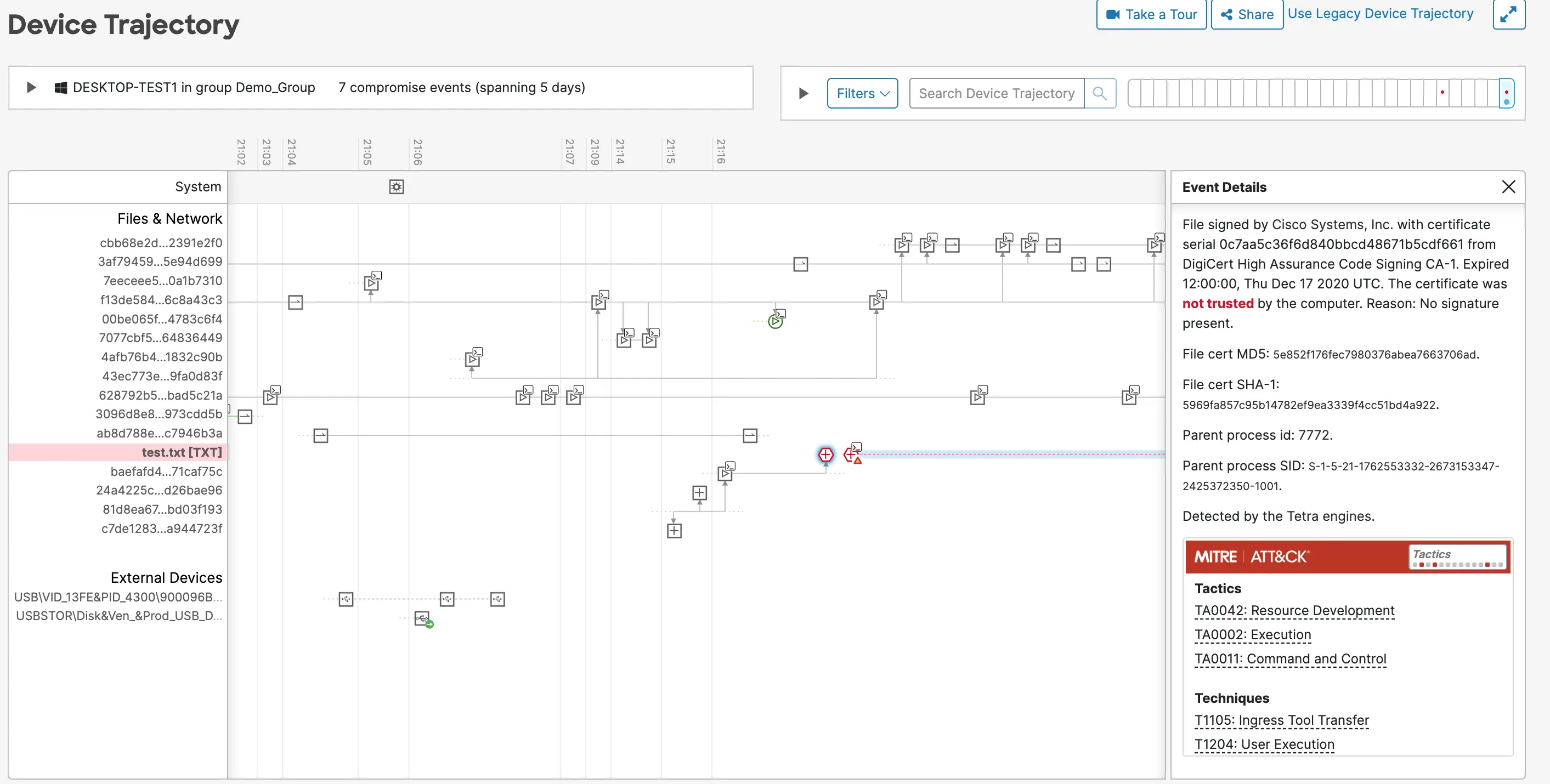 The screenshot below shows the Device Trajectory view in the Secure Endpoint console, with the Activity Telemetry captured.
