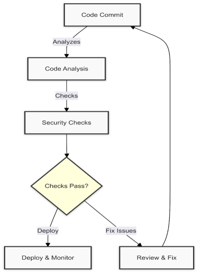 Automated Security Pipeline in DevOps: This cyclical process-from code commitment through security checks to deployment-ensures rapid and secure software delivery.