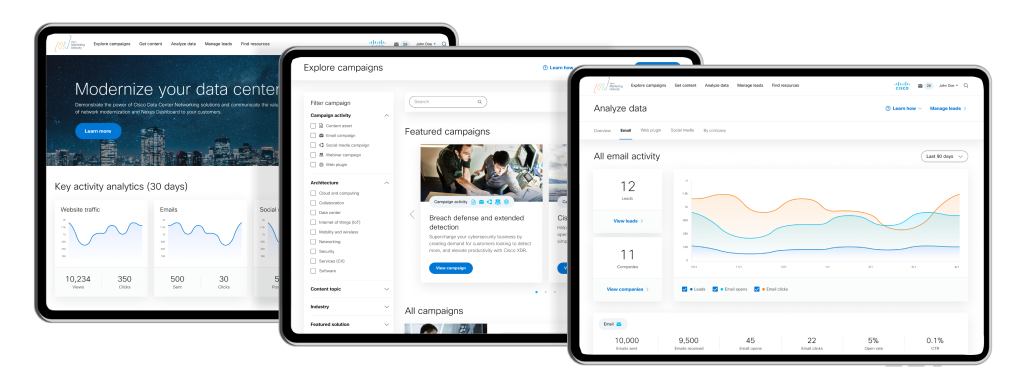 - Personalized experience: The goal is to deliver a seamless digital demand engine where partners can easily and quickly find -in five clicks or less -the right marketing asset, campaign, or learning resource to co-market solutions with Cisco and deliver a personalized experience to support partners as they grow their business in managed services, SaaS, and among SMB customers.