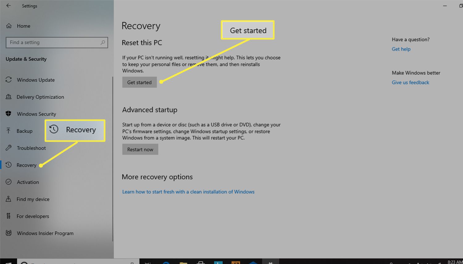 - On Windows 10, go to Settings > Update & Security > Recovery > Get started.
