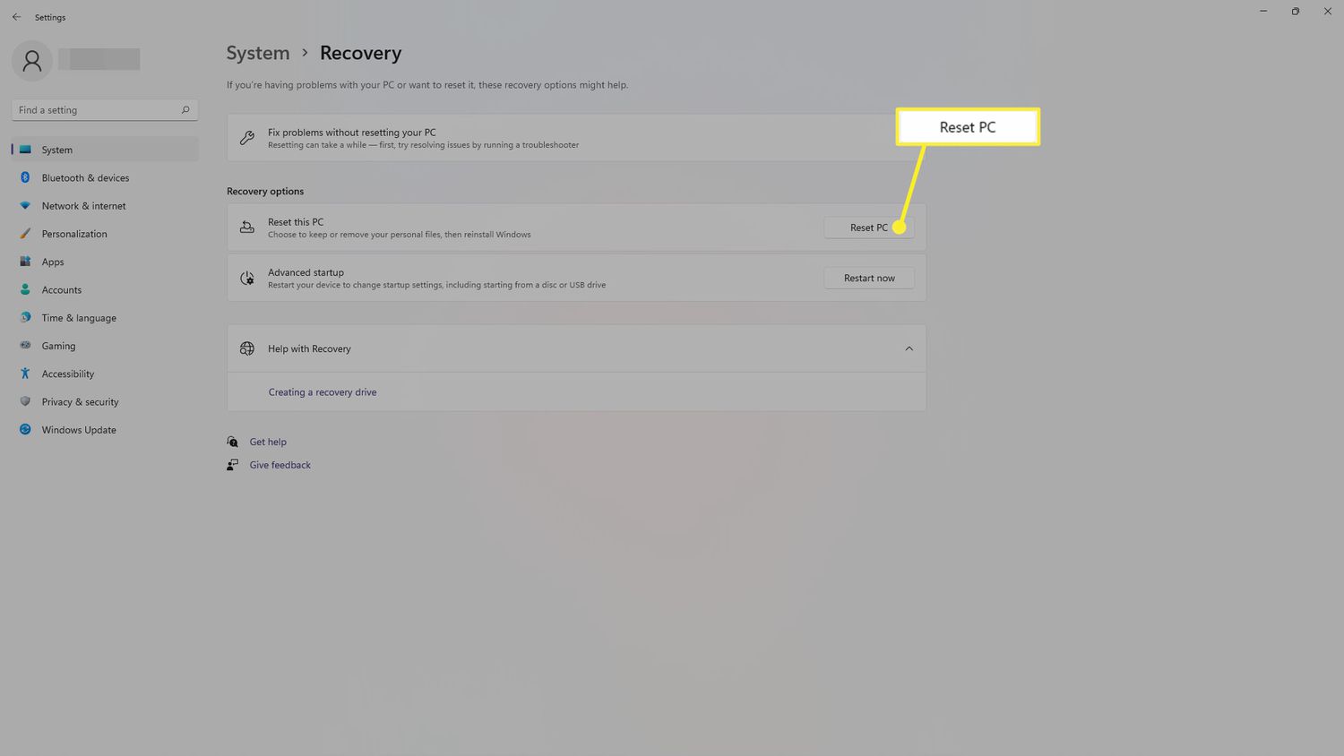 - On Windows 11, go to Settings > System > Recovery > Reset PC.