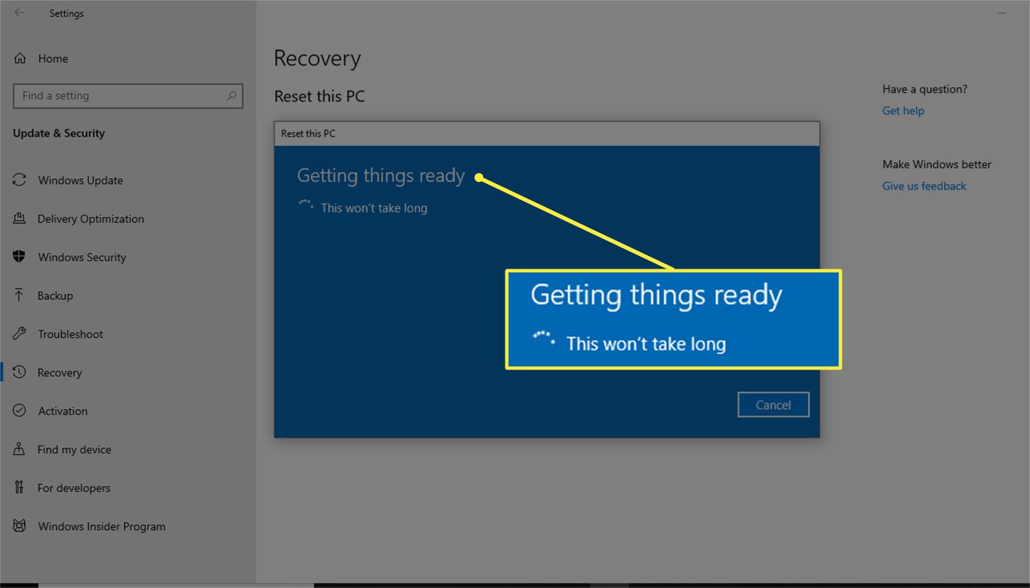 You'll see a message saying This won't take long as the system readies your machine for a reset.