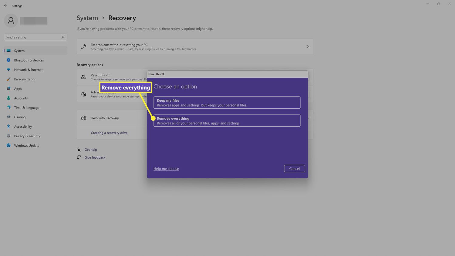 This option is the faster of the two, but it's potentially less secure if you'll be giving your laptop away. You may want to opt for the longer but more thorough option to remove all files and clean the drive.