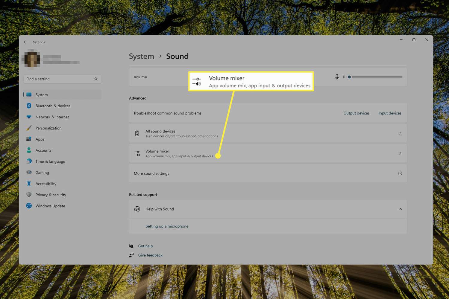 Once you're in Settings, select Sound for settings pertaining to output devices, input devices, troubleshooting tools, the volume mixer, and more. Another way to jump directly into the sound settings is to right-click the volume icon in the taskbar and choose Sound settings. From that same menu is Open volume mixer, which will do just that.