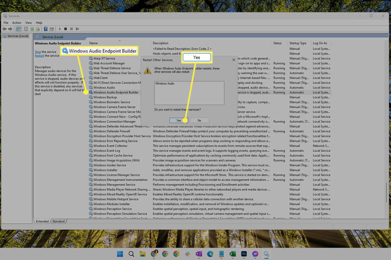 - Reset audio services: Open Services, right-click Windows Audio Endpoint Builder, then Restart > Yes.