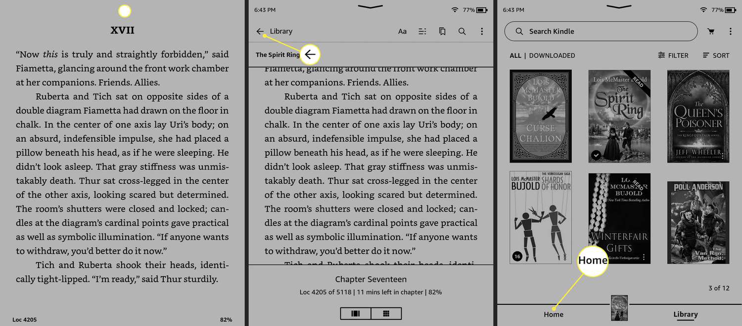- In the Kindle app: Tap the middle of the page, tap the down arrow, then tap the house icon if necessary.