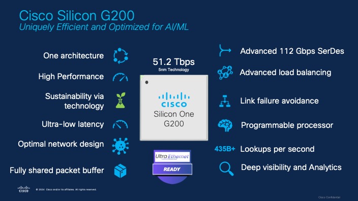 Leveraging Cisco Silicon One G200, Cisco Nexus 9000 Series Switches are engineered to meet these demands with high-density 800G fabrics (see Figure 1) -making them ideal for next-generation leaf-and-spine network designs for cloud architecture, high-performance computing (HPC), and large-scale AI/ML workloads (see Figure 2). For example, Cisco Silicon One G200 uses advanced load balancing and fault detection to help improve job completion times (JCTs) for AI/ML workloads.