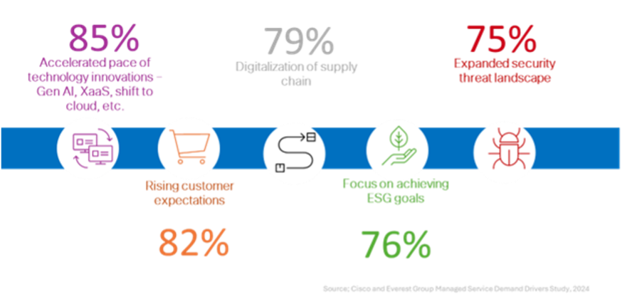 The top 5 ranked priorities for managed services indicate a shift in focus: accelerating innovation (85%), enhancing customer experiences (82%), optimizing supply chains (79%), achieving sustainability goals (76%), and managing risk and compliance (75%). It's no longer just about supporting IT back-office functions; it's about driving the business strategy forward and enabling a more agile organization.