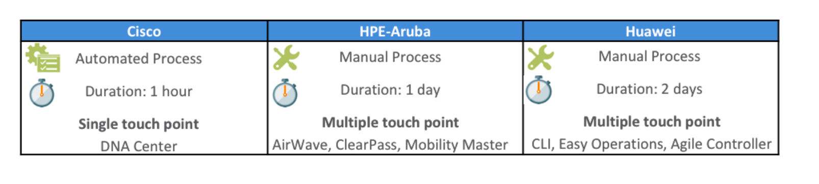 Comparing the segmentation capabilities of Cisco, Aruba and Huawei, several key takeaways can be learned from the independent Miercom report. In the Miercom comparison the bottom line is there is a clear benefit with the automated, single touch point approach of Cisco compared to the manual -multi-touch point approaches of HPE-Aruba and Huawei.