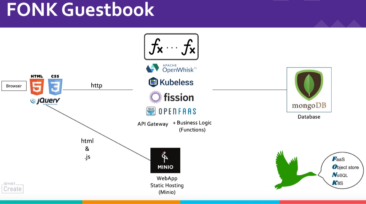 If you've ever wanted to learn the fundamentals of serverless and get your hands dirty building a LAMP-like application, DevNet Create has a session for you. On both April 24 and April 25 from 11:45a to 12:30p, I'll be running an exercise entitled "FONK: FaaS on K8s working examples." During our 45 minutes together, we'll build a serverless version of the Guestbook application, which is the "Hello World" of the Kubernetes (K8s) community. Only instead of using containers directly the way that the original Guestbook does, we'll use a Function-as-a-Service (FaaS) runtime, an Object Storage service, and a NoSQL server all running on top of K8s.