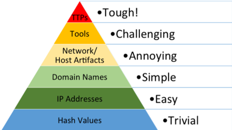 Threat Hunting also allows security teams to address the top most tiers of the Pyramid of Pain, making more difficult for adversaries to impact environments. At the "Tools" level, analysts are taking away one or more specific tools that an adversary would use in an attack. At the apex of the pyramid are the TTPs (Tactics,Techniques and Procedures), when analysts detect and respond at this level, they are operating directly on the adversary's behaviors, not against their tools, forcing them to learn new behaviors.