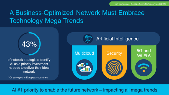 To be truly effective, automation needs to be augmented by advanced visibility and assurance. That's where artificial intelligence(AI) and machine learning (ML) come in. 43% of network strategists in Europe recognize AI as a priority for achieving a more advanced network, and 63% of you project using AI-enabled predictive insights or prescriptive mediation in the next two years. 45% predict that they will have AI-enabled SD-WAN in the next two years, up from 19% today. AI/ML will help automate the entire network lifecycle so that NetOps teams have more time to be strategic-not reactive.