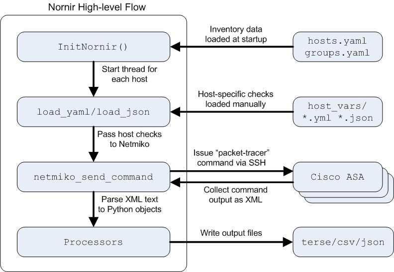 For the visual learners, here's a high-level diagram that summarizes the project's architecture. After Nornir is initialized with the standard hosts.yaml and groups.yaml inventory files, the host-specific checks are loaded for each device. Then, Nornir uses Netmiko to iteratively issue each packet-tracer command to each device. The results are recorded in three different output files which aggregate the results for easy viewing and archival.