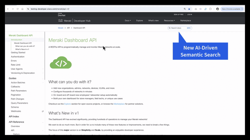 In today's fast-paced digital landscape, finding precise and relevant information is crucial. At DevNet, we continuously innovate to enhance the user experience and streamline how our users interact with our platform. Today, in collaboration with the Meraki API team, we are excited to announce the launch of our new AI-driven Semantic Search and Summarization beta feature for Meraki API documentation. This powerful new tool leverages advanced Artificial Intelligence (AI) and Large Language Models (LLMs) to revolutionize how users search and retrieve information, making it more accurate, efficient, and intuitive.