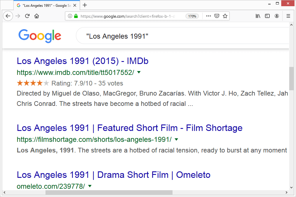 This search is now almost completely saturated with results about a 2015 movie called Los Angeles 1991. The reason for this is clear: the quotation marks demanded that all results include all three items in that order.