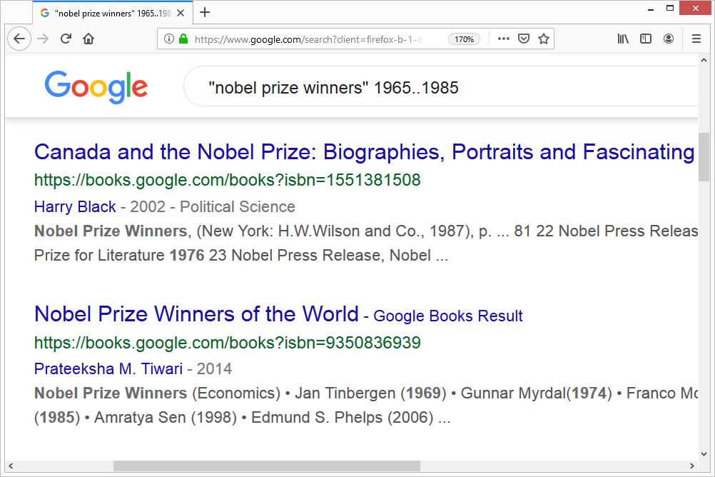 - Advanced: Include specific dates (ex. "nobel prize winners" 1965..1985).