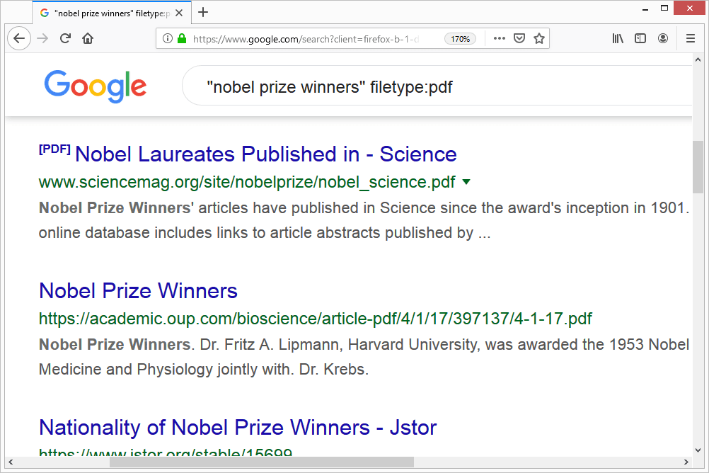 The above example will ensure that all results include those three words in quotes. Not just Nobel, Prize, or Winners, but all three, and in that exact order.