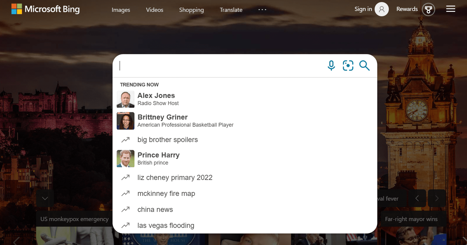 These search engines have identical features when it comes to finding popular searches. All you have to do to see what's popular on Bing or Yahoo is select the text box and read through the trending search items.