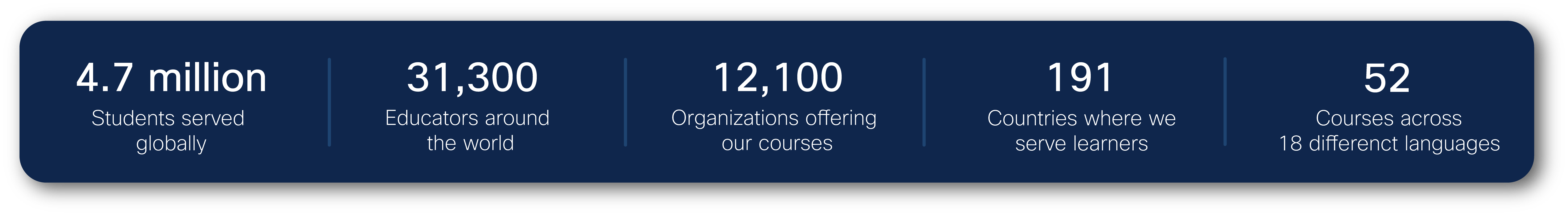 Education research shows that engagement is most effective when it includes hands-on learning experiences, high-quality interactions with educators, and localized resources and support networks. Through our global partnerships, students receive the reliable quality of Networking Academy courses developed by experts around the globe, delivered in their own communities. This focus on local engagement ensures that students aren't just participants but active, supported learners.