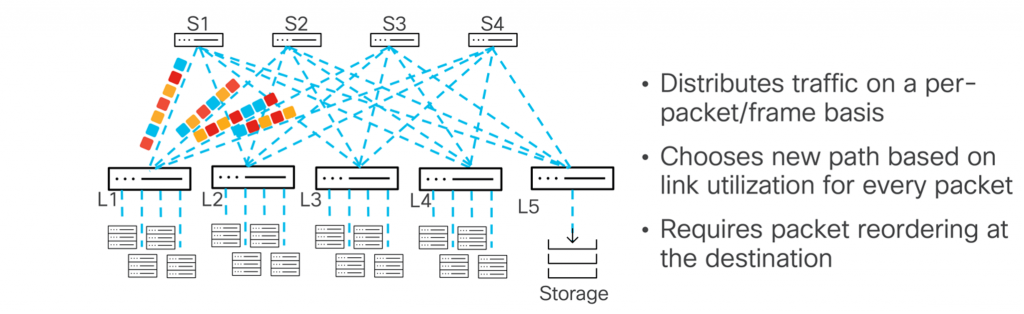 The Nexus 9000 Series can spray packets across the fabric using per-packet load balancing, sending each packet over a different path to optimize traffic flow. This should provide optimal link utilization as packets are distributed randomly. However, it's important to note that packets may arrive out of order at the destination host. The host must be capable of reordering packets or must handle them as they arrive, maintaining correct processing in memory.