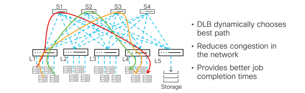 As the network state is constantly changing, load balancing needs to be dynamic and driven by real-time feedback from network telemetry or user configurations. Dynamic load balancing (DLB) allows traffic to be distributed more efficiently and dynamically by considering changes in the network. As a result, congestion can be avoided and overall performance improved. By continuously monitoring the network state, it can adjust the path for a flow-switching to less-utilized paths if one becomes overburdened.