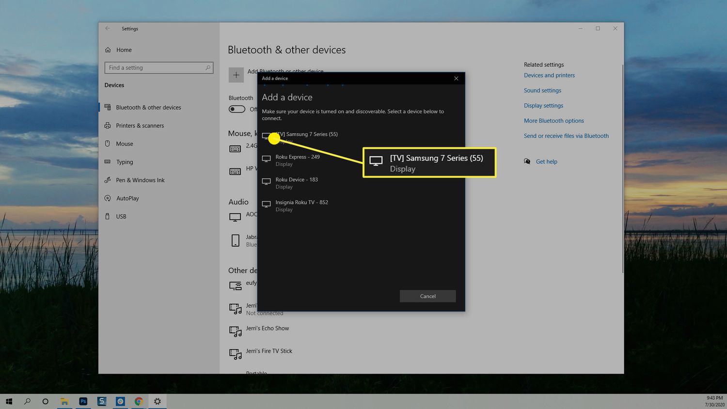 Make sure both your laptop and your TV are connected to the same network and then go to the Windows logo button (Start) > Settings > Devices.