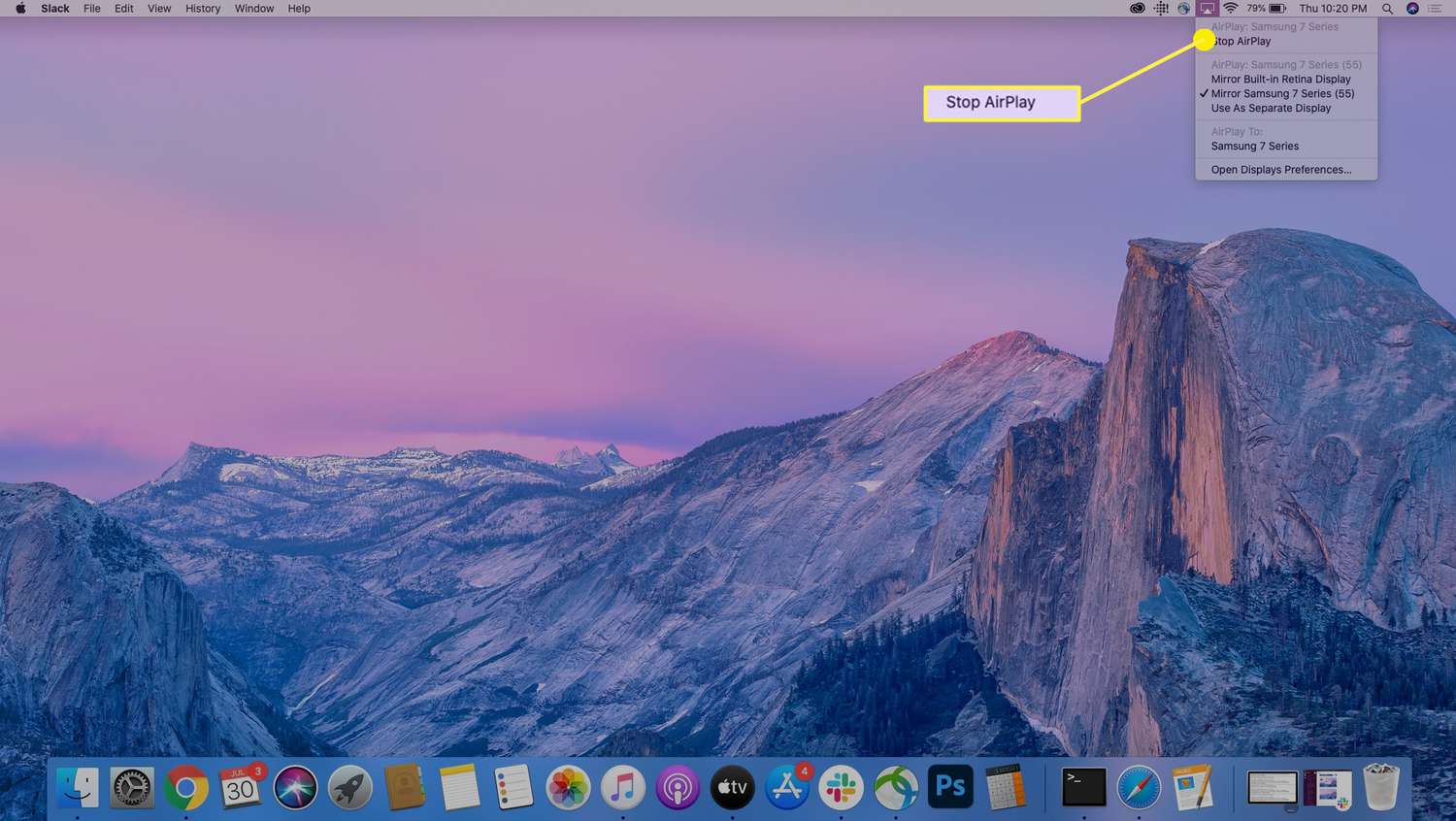 When you're finished working and want to end your mirroring session on a MacBook, click the AirPlay icon again and select Stop AirPlay. Your MacBook should stop mirroring and your TV will immediately become available again.