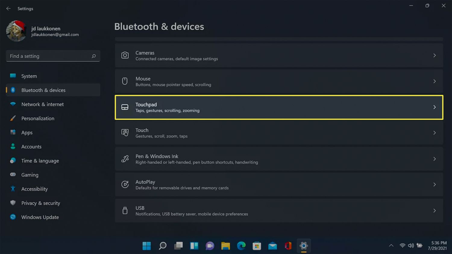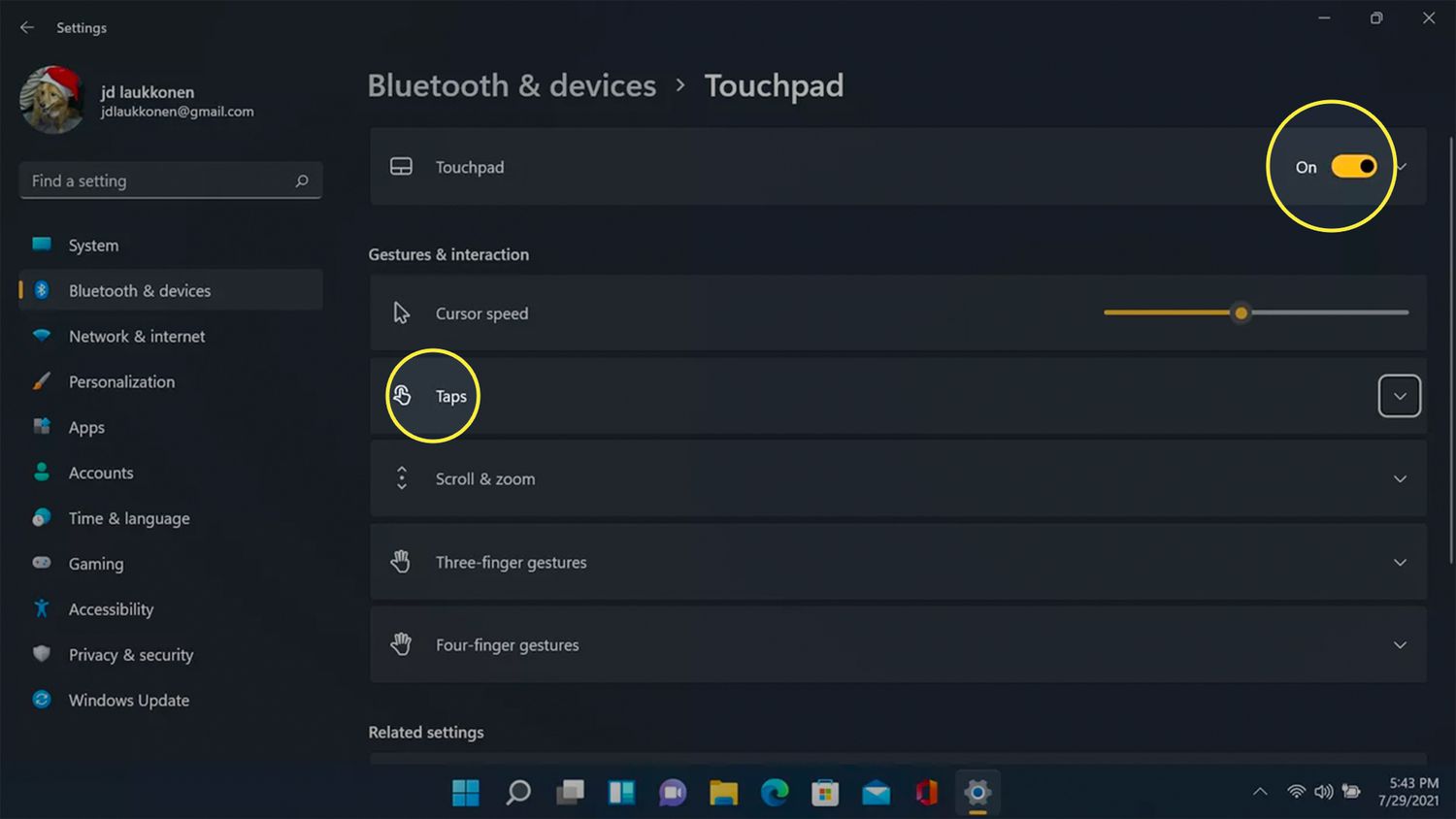 If you have disabled the touchpad in Windows 11, you can turn it back on by navigating to Settings > Bluetooth & devices > Touchpad and either clicking the Touchpad toggle or clicking the checkboxes in the Taps section.