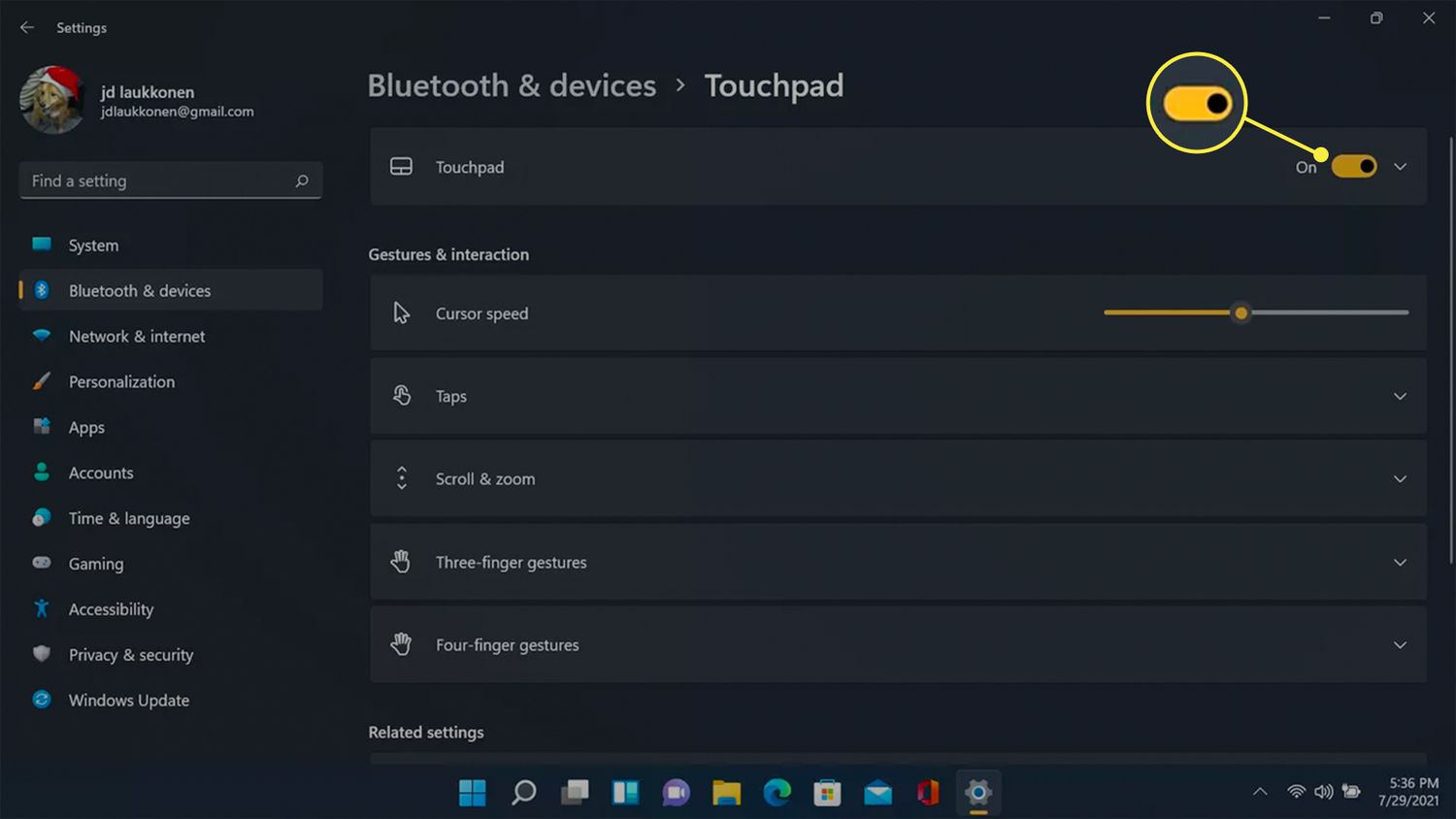 - Open Settings > Bluetooth & devices > Touchpad, and click the Touchpad toggle.