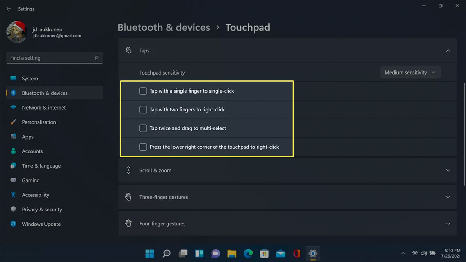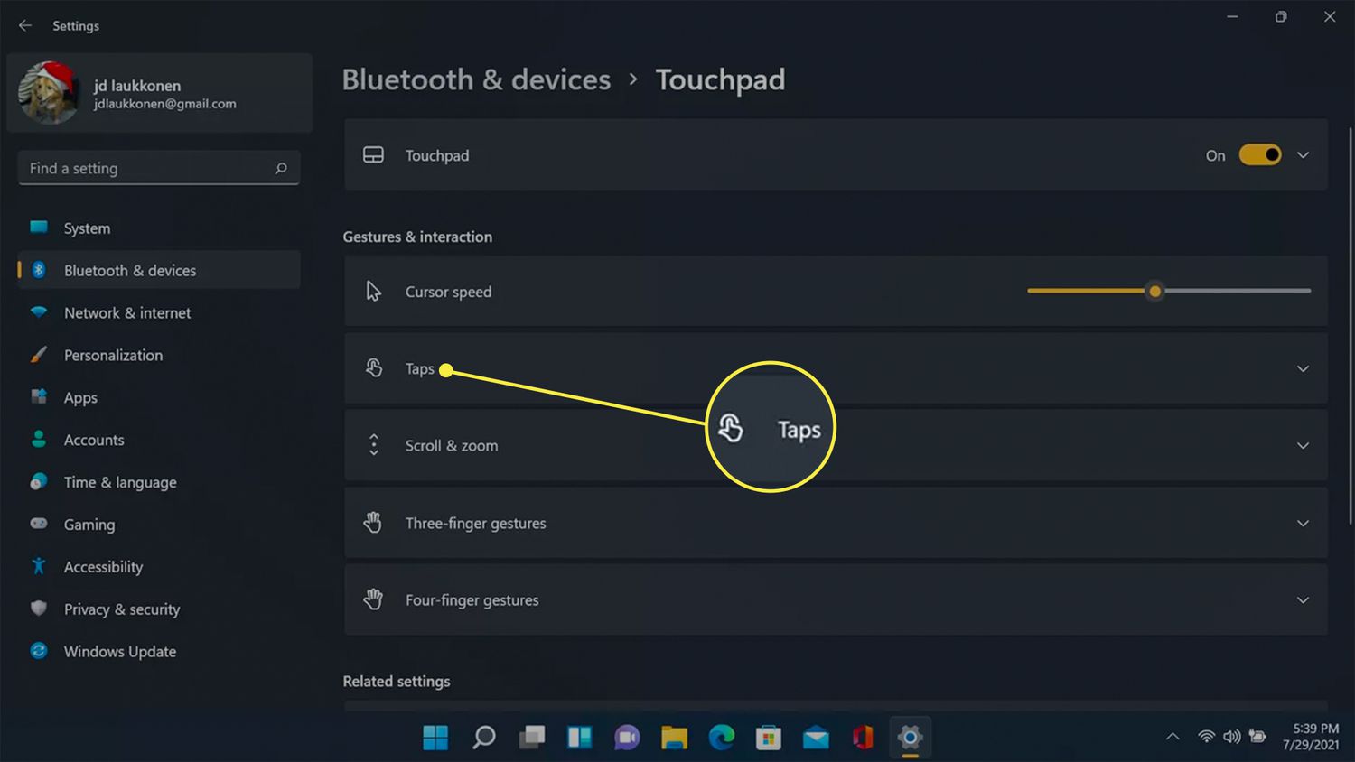 - To lock touchpad tap-clicking: Settings > Bluetooth & devices > Touchpad > Taps, then remove all checkmarks.