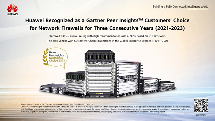 Jun 26, 2023[Shenzhen, China, June 26, 2023] Recently, Huawei was named a Customers' Choice in the 2023 Gartner Peer Insights "Voice of the Customer for Network Firewalls", marking the third year in a row receiving this distinction. In the report, Huawei received an overall rating of 5.0/5.0 stars and 99% recommendation rate based on 213 reviewers. Moreover, Huawei for its firewalls received the distinction as a Customers' Choice in 7 market segments: Global Enterprise (10B+ USD)/ Large Enterprise (1B - 10B USD)/ Midsize Enterprise (50M - 1B USD), manufacturing/service industry, and Asia Pacific/Europe, the Middle East and Africa region.