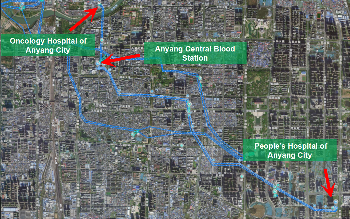 In Anyang, drone takeoff and landing ports and 5G-A ISAC low-altitude networks have been established at key locations such as Anyang Central Blood Station, the People's Hospital of Anyang City, and the Oncology Hospital of Anyang City. The deployment supports three critical medical scenarios: blood delivery, inter-campus hospital material logistics, and citywide medical alliance resource sharing. Among them, route 1 covers 7.5 kilometers from the Anyang Central Blood Station to the People's Hospital of Anyang City, while route 2 covers 1.68 kilometers from the Anyang Central Blood Station to the Oncology Hospital. Along both routes, drone takeoff and landing ports and 5G-A ISAC base stations have been established, creating a secure and reliable lifeline.