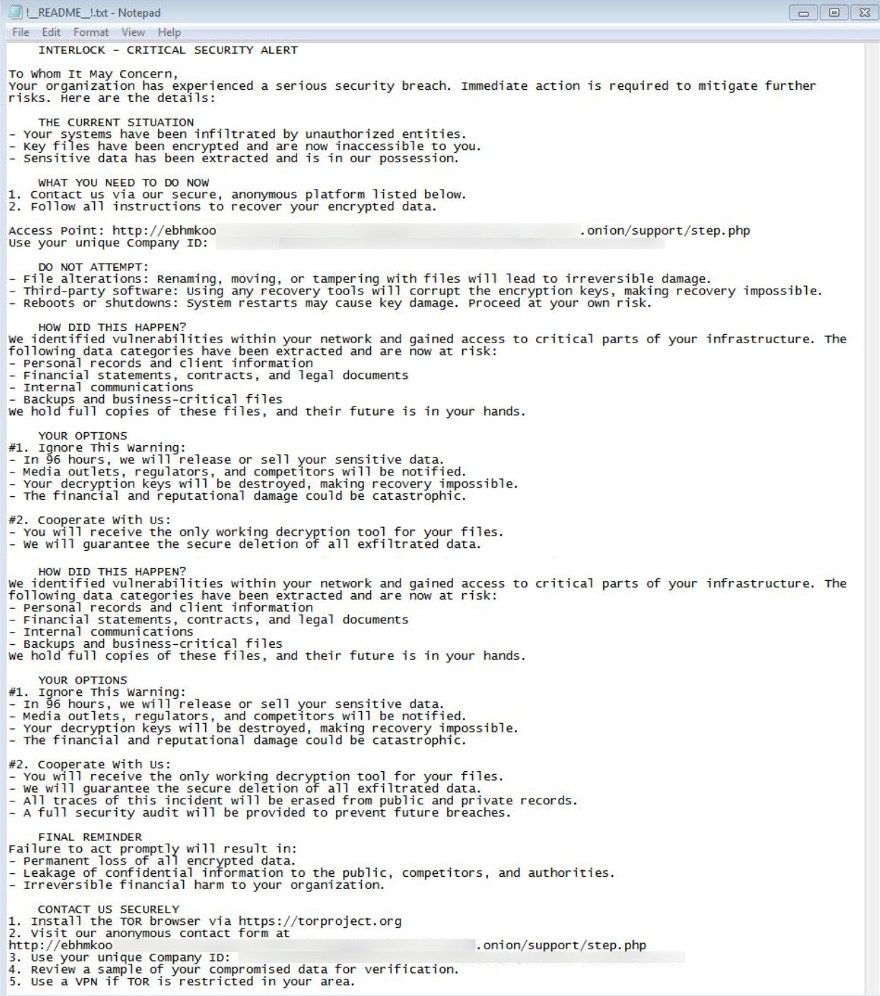 The Interlock ransomware comes in Windows and FreeBSD versions. It encrypts files on victims' machines and demands a ransom to decrypt them via dropped ransom notes.