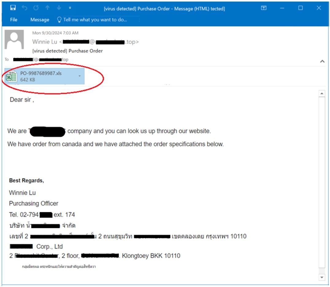 The phishing email is shown in Figure 2. It contains an attached malicious Excel file disguised as an order file to convince the recipient to open the document.